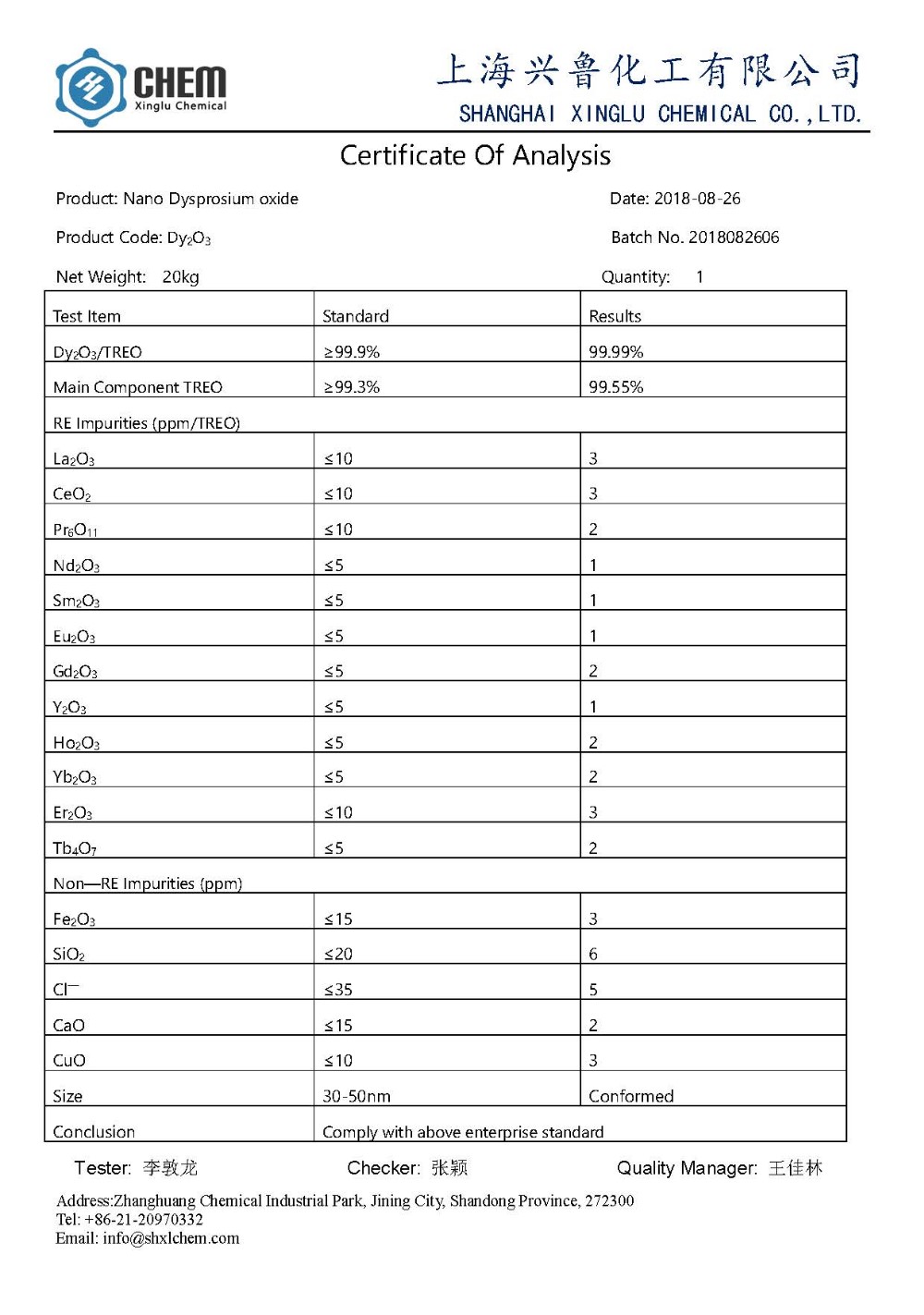 Specification for Nano Dysprosium Oxide powder