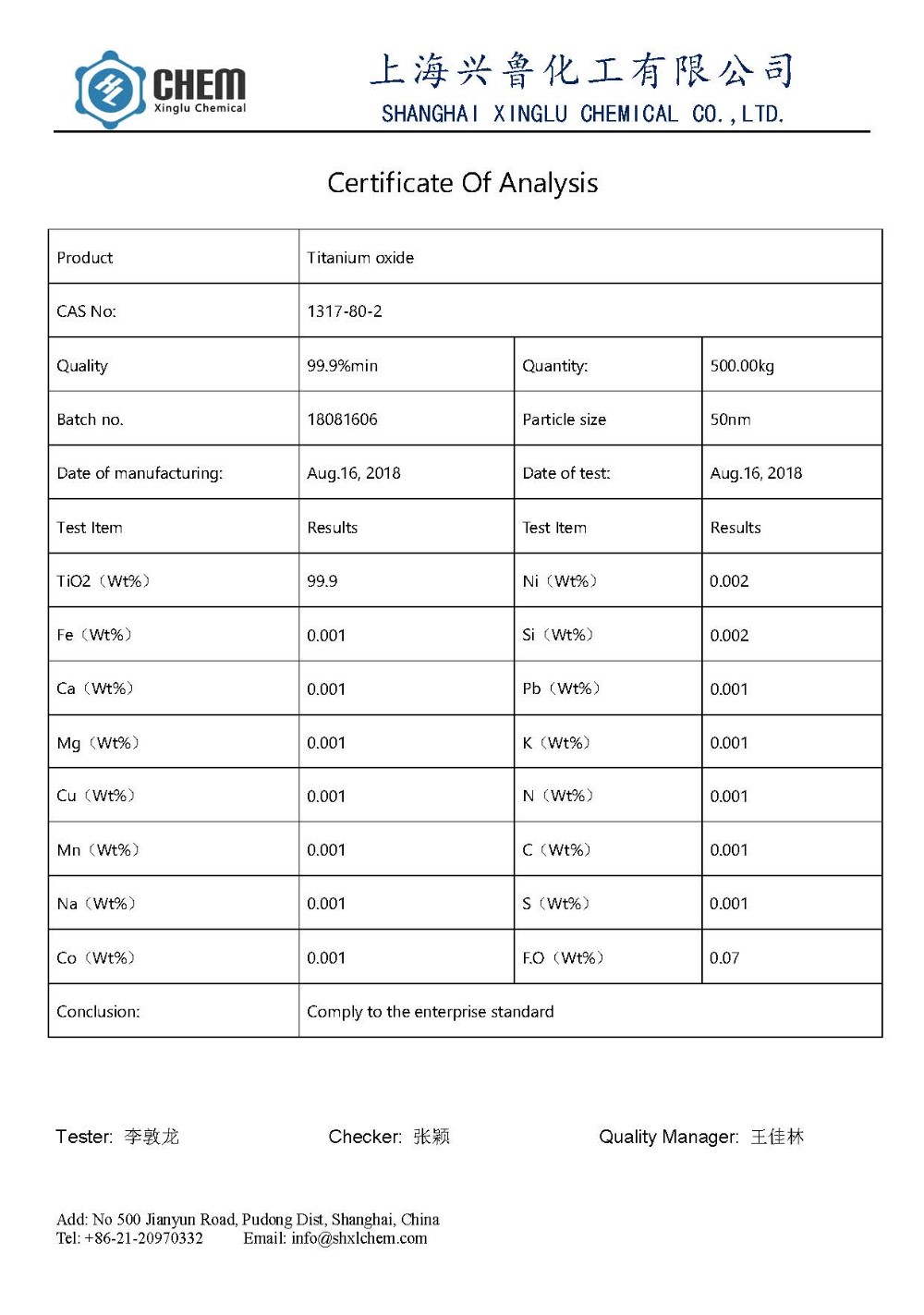 5. Нано титановый диоксид порошкаприменяется в качестве покрытия для бумажной промышленности: используется для улучшения впечатляемости и непрозрачности бумаги и используется для производства титана, сплава ферротитанового сплава, карбид-сплава и т. Д. В металлургической промышленности;